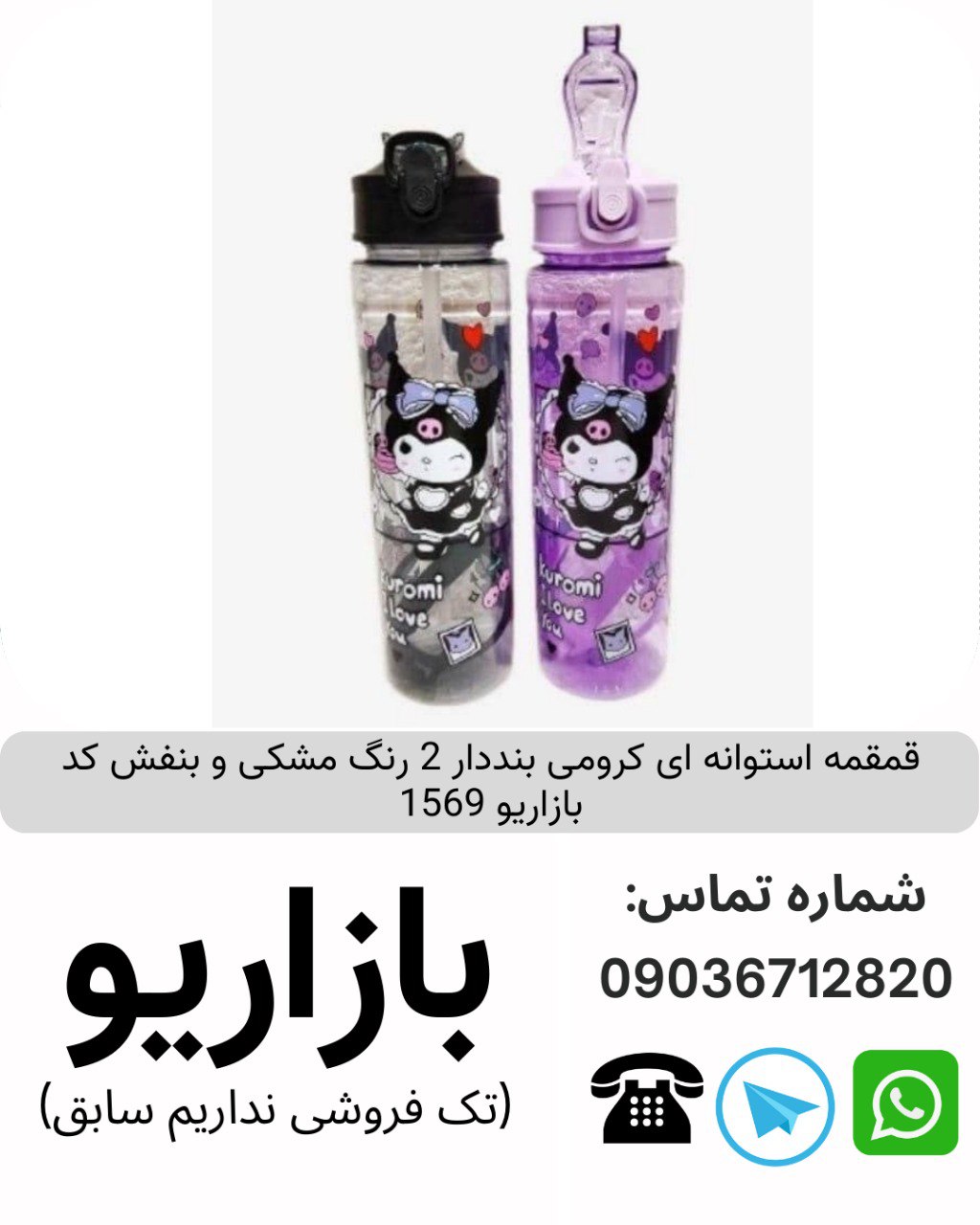 قمقمه استوانه ای کرومی بنددار 2 رنگ مشکی و بنفش کد بازاریو 1569